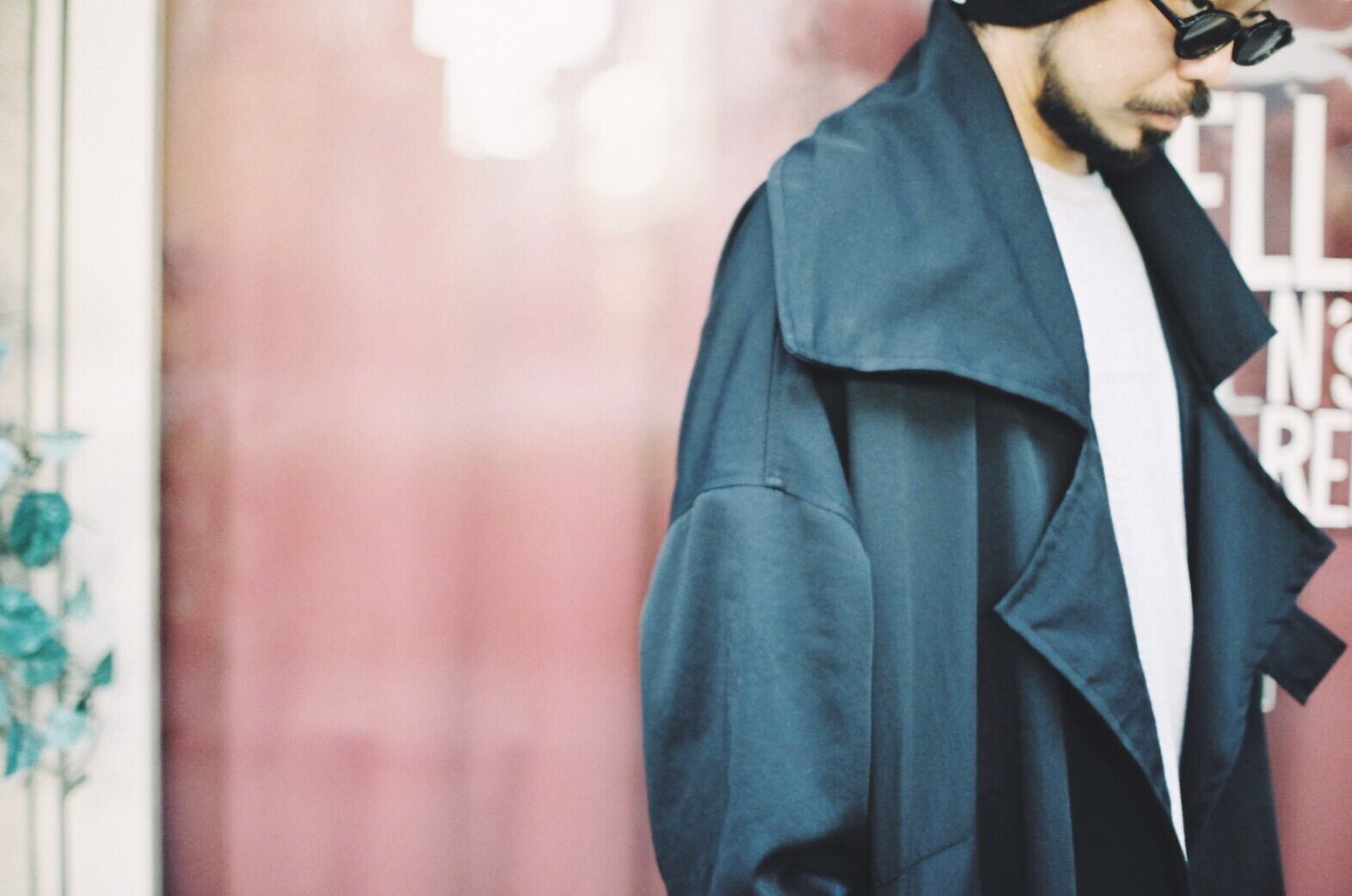 大きな衿とフロント部分の存在感、そしてルーズ&ワイドなシルエットは様々な表情を魅せてくれる役者な一枚。