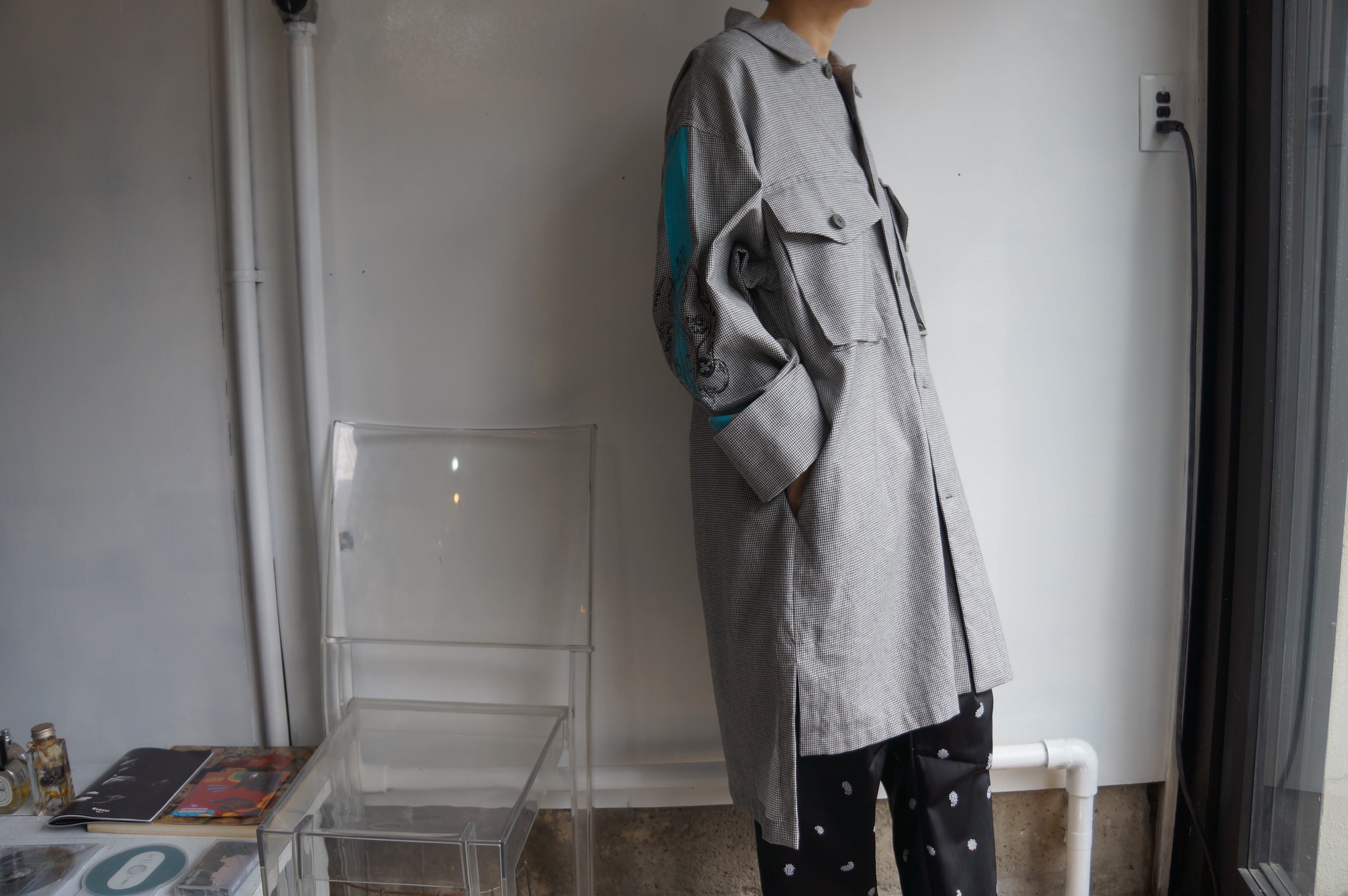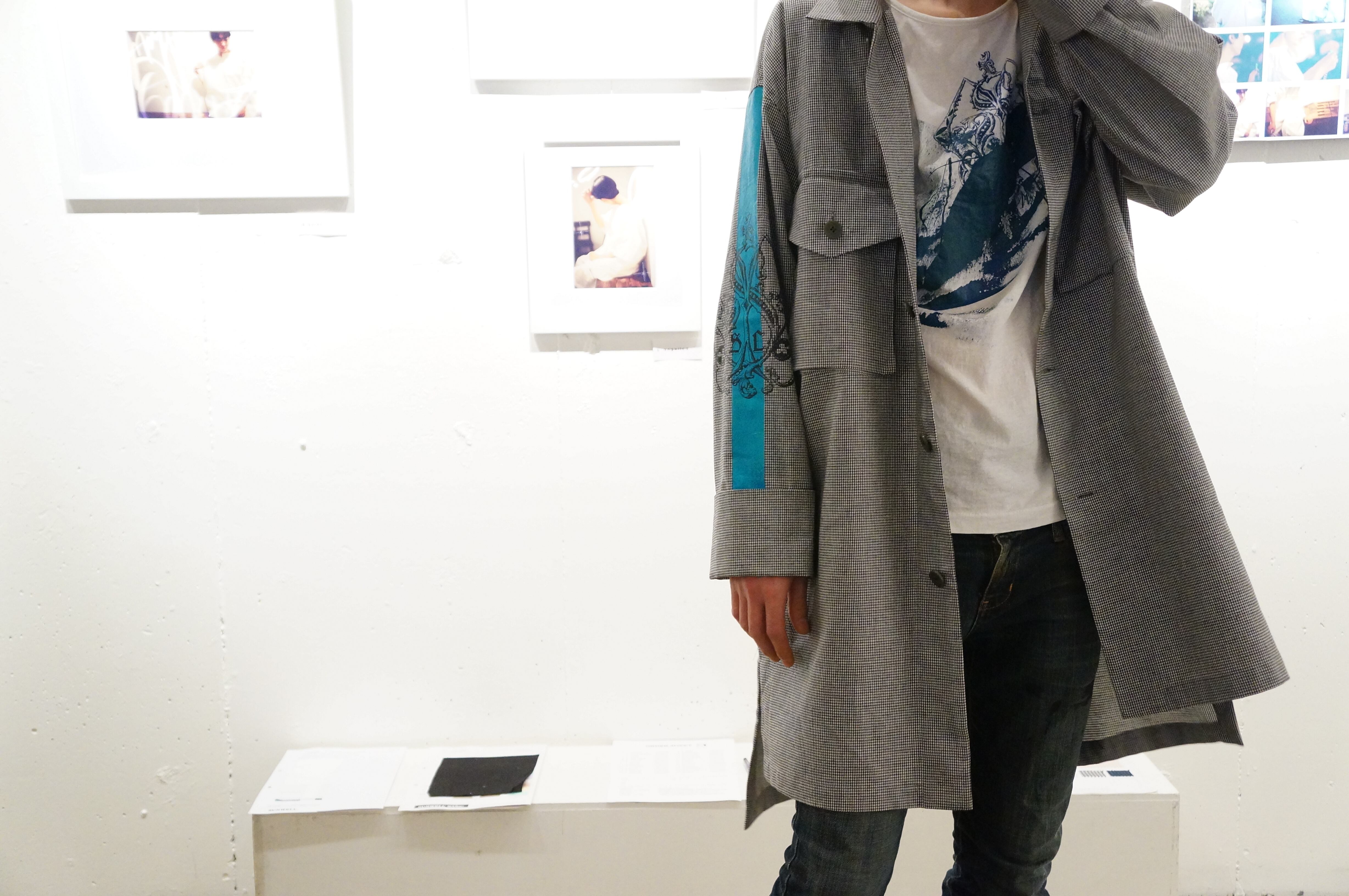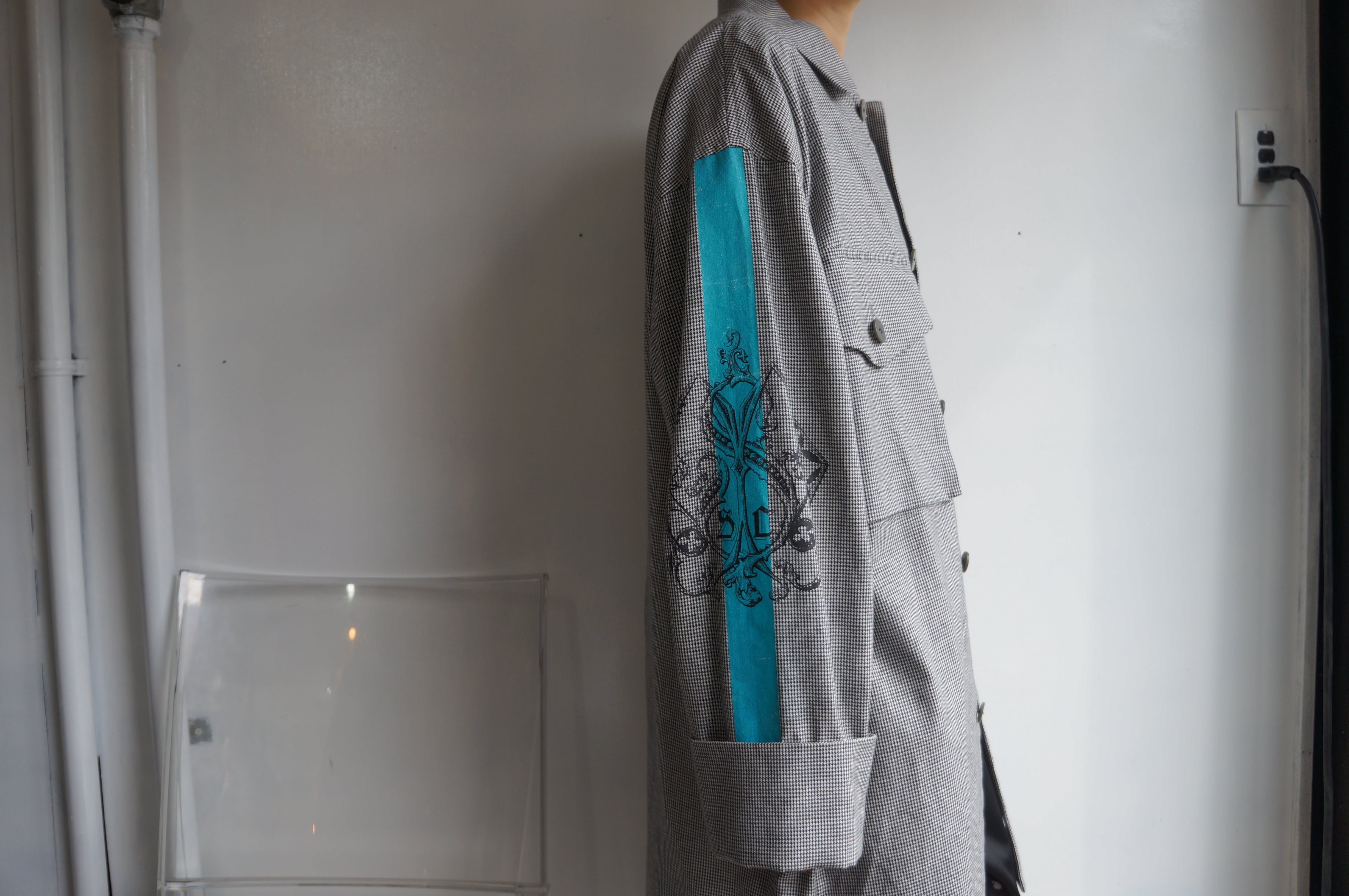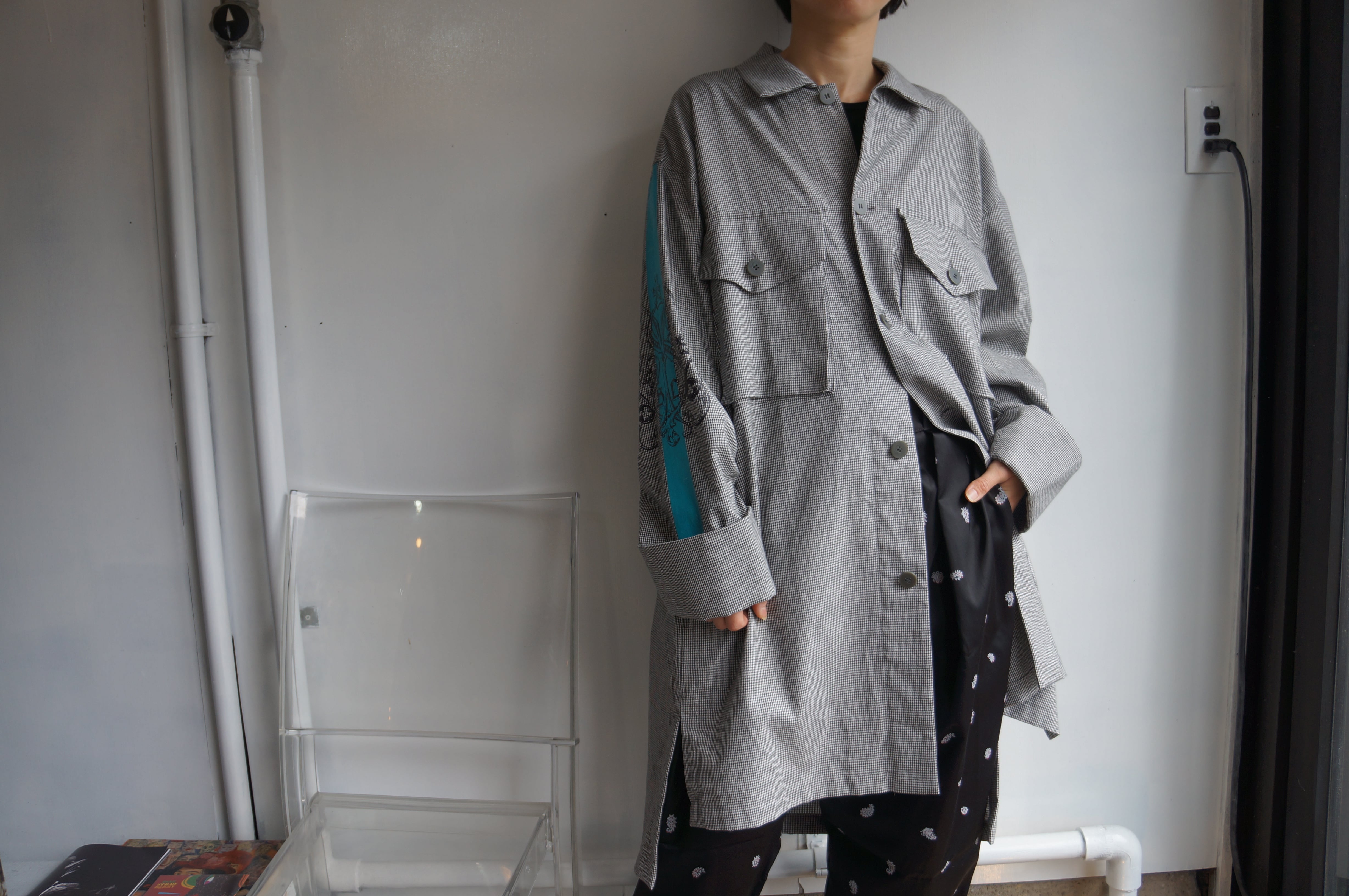 大きめのステンカラーと袖口の折り返し、ATOSONE氏が施した右袖のプリントにより羽織るだけで存在感抜群。